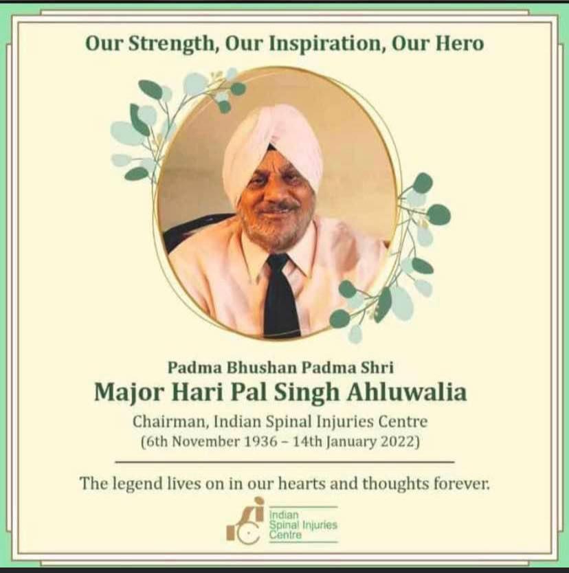 With profound grief, we sadly inform that Major HPS Ahluwalia (Retd) left for his heavenly abode on January 14, 2021. An avid mountaineer and a keen adventure enthusiast, Maj Ahluwalia left an indelible mark in many fields including adventure, sports, environment, disability and social work. He was awarded Padma Bhushan, Padma Shri & Arjuna Award for his contributions. After scaling Mt Everest in May 1971, he became a quadriplegic due to a Spinal Cord Injury sustained during the Indo-Pak war in September 1971. After his rehabilitation abroad, he decided to set up a world class Centre for rehabilitation of persons with spinal cord injury; Indian Spinal Injuries Centre (ISIC) came into being under his superb guidance. In him, The Spinal Foundation (TSF) has lost a worthy Patron and the First President of the Governing Board.